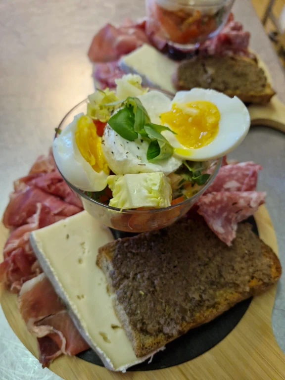 Charcuterie, fromage, pain maison, petite salade et 1 verre de vin au prix de 18 euros
